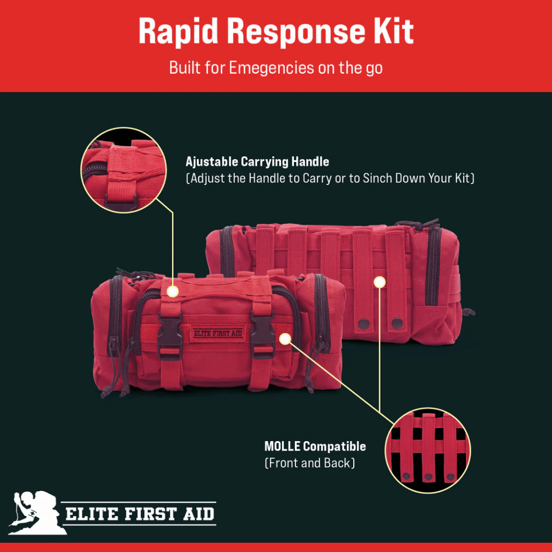 Built on feedback from tactical professionals, this lightweight, MOLLE-compatible, Rapid Response Trauma kit is designed to ensure bleeding control essentials like a tourniquet, hemostatic gauze, and trauma dressings are organized for immediate access when every second counts.