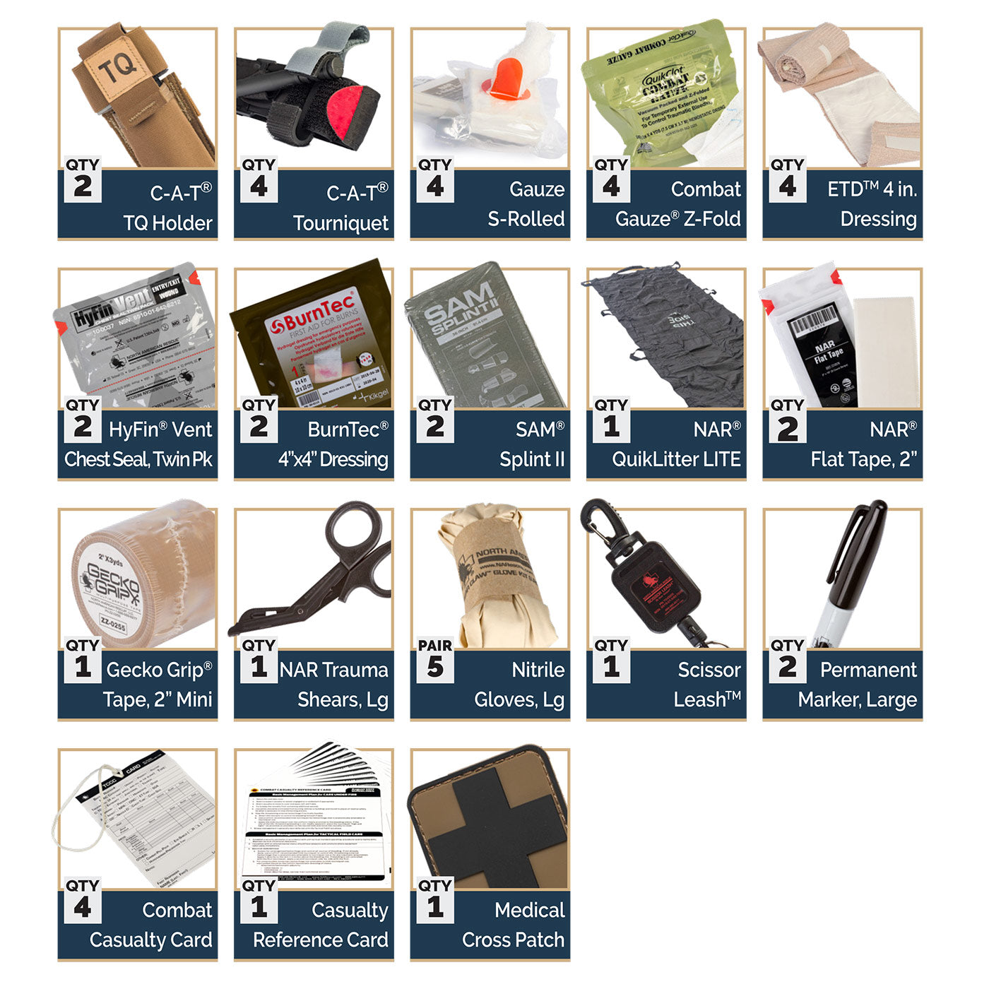 Yes — every trauma kit includes the same medical-grade supplies trusted by first responders, law enforcement, and military medics. From CAT® tourniquets to hemostatic gauze and HyFin® chest seals, our gear isn’t imitation-grade — it’s built for real emergencies, where performance matters most.