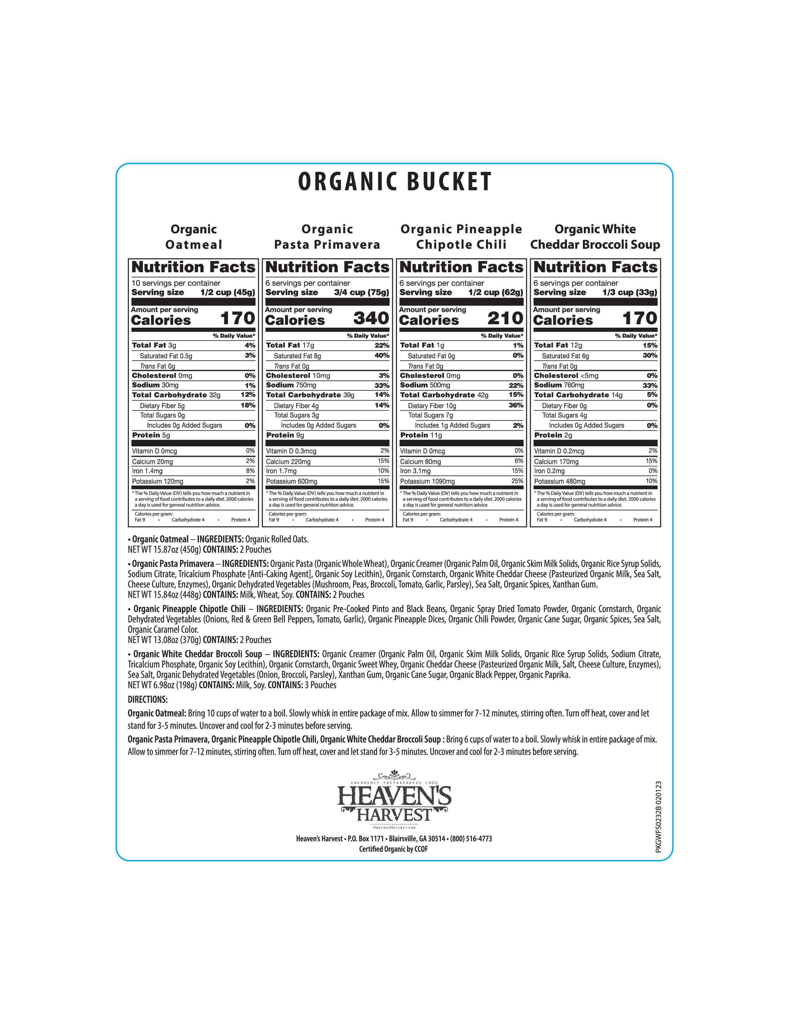 Organic Meal Bucket - 1 Person 1 Week - 62 Servings - Emergency Food Survival Kit