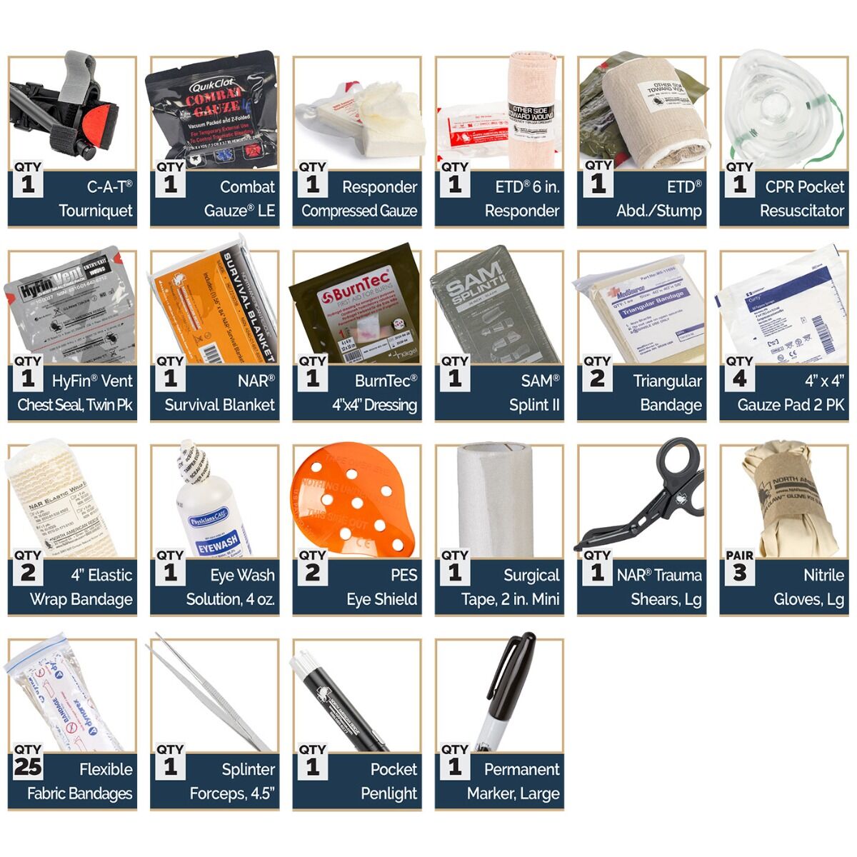 Yes — every trauma kit includes the same medical-grade supplies trusted by first responders, law enforcement, and military medics. From CAT® tourniquets to hemostatic gauze and HyFin® chest seals, our gear isn’t imitation-grade — it’s built for real emergencies, where performance matters most.