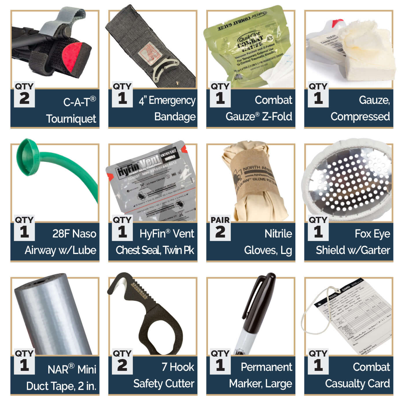 • Combat-Proven Essentials: Includes CAT® Tourniquets, Combat Gauze®, and airway management tools.